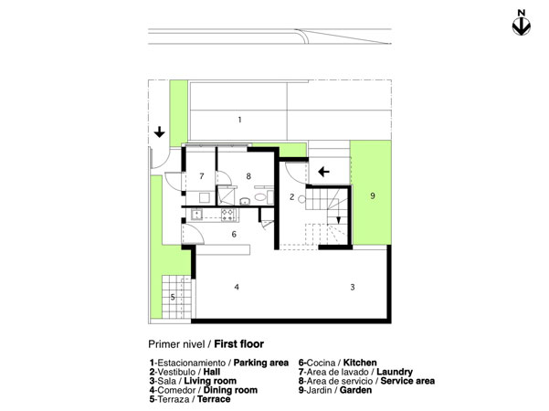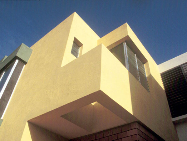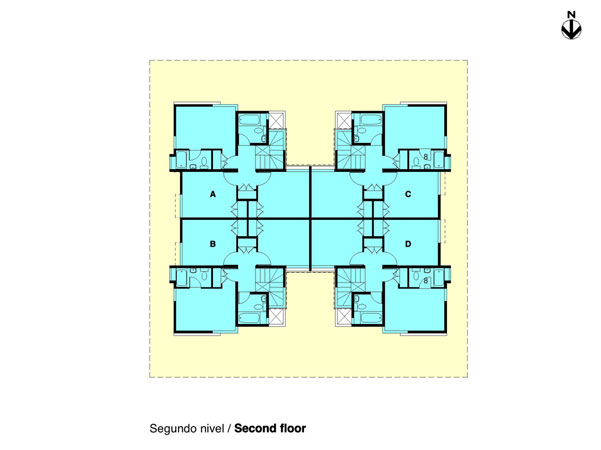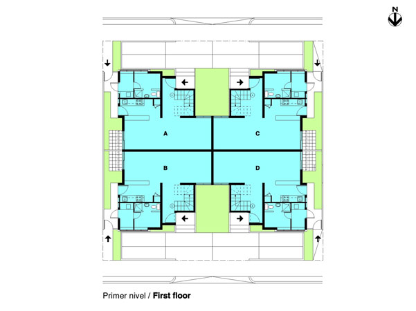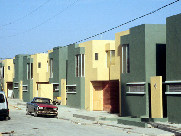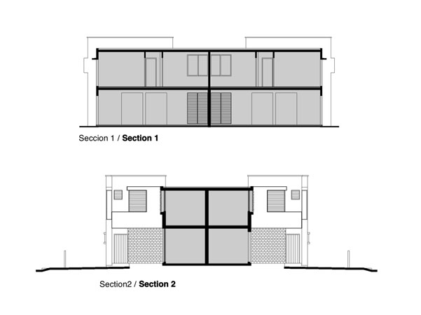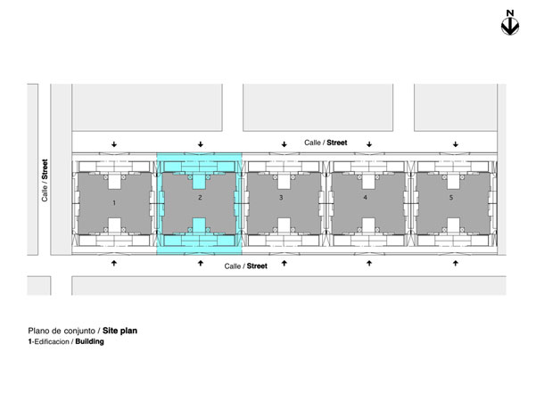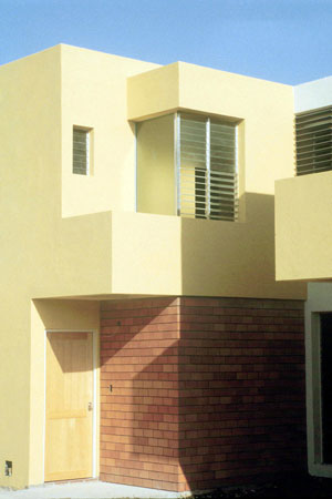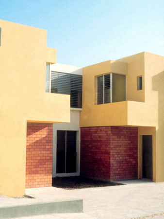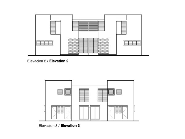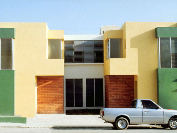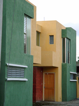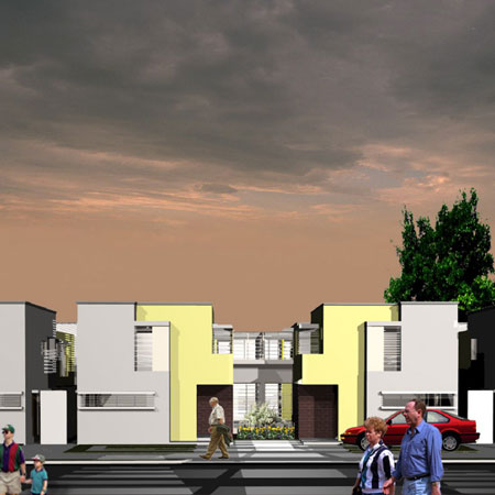 El lugar a intervenir es un desarrollo colindante con el litoral sur de la ciudad, y es un lote rectangular de 2000 mts2 (20 x 100) orientado norte y sur, por su lado mayor y limitado por vias , la parte mas corta esta limitada al este por viviendas y al oeste por un lote baldio. A) Intervenimos el lote dividiendolo en 5 partes iguales, b) subdividimos una de las partes en 4 unidades La geometria general propone (20 unidades en total) apareadas en sentido norte y sur, hacia la calle,con estacionamiento frontal y un jardin compartido que las separa, incision en el bloque, que produce una definicion de los volumenes, individualizando la unidad habitable, y permitiendo la integracion y ventilacion de las areas sociales con el jardin, estas proyectadas hacia el centro e interconectadas ademas con un patio-terraza lateral; Las areas de servicio y lavado estan conformadas hacia la calle, cual barreras de proteccion de la intimidad interior. En el segundo nivel accediendo por escaleras de madera se disponen las areas dormitorio, relacionados con el patio lateral, el segundo con el area de jardin,protegido de las inclemencias por celosias fijas de aluminio color verde. y el principal con la calle Toda la imagen exterior es una composicion de volumenes no puros (mestizos) reforzados por el uso de color, el mas proximo a la calle es de color verde, y lineas horizontales (blancas) que enmarcan las ventanas altas de celosias de aluminio color verde, camufladas con el volumen, las ventanas superiores del dormitorio frontal esta compuesta de un paño de vidrio fijo, y otro de celosia de vidrio en dos tonalidades (la parte superior color bronce y la inferior vidrio martillado; el otro volumen compuesto (de color amarillo) se retrotrae se desplaza produciendo un alero sobre la entrada principal y en el quiebre una ventana de esquina para iluminar la escalera y ventilar la unidad.Nosotros buscamos en estos proyectos (del mercado especulativo) ofrecer una opcion contemporanea del hacer arquitectonico,en oposicion a los tradicionales patrones que rigen el negocio inmobiliario.