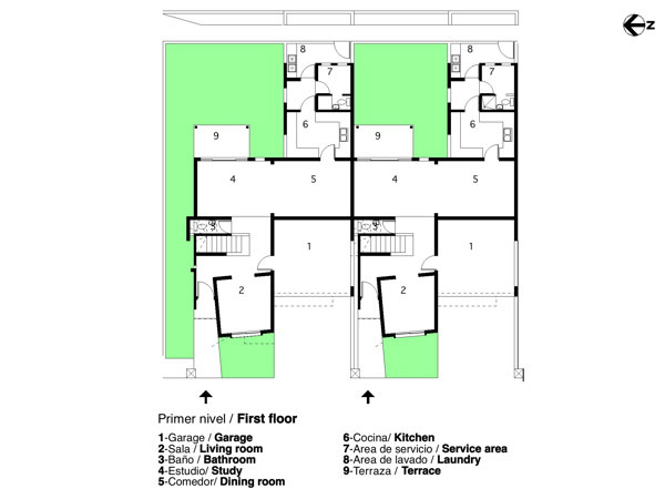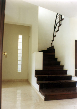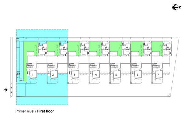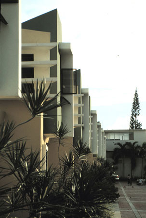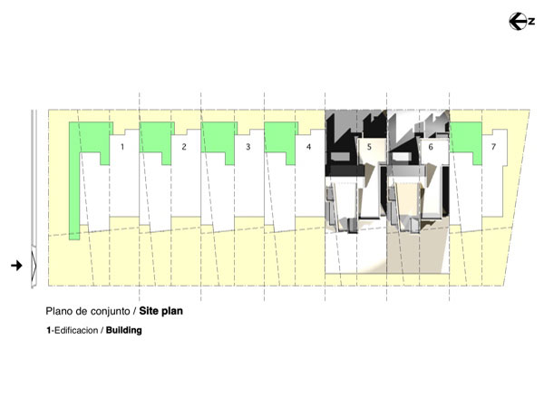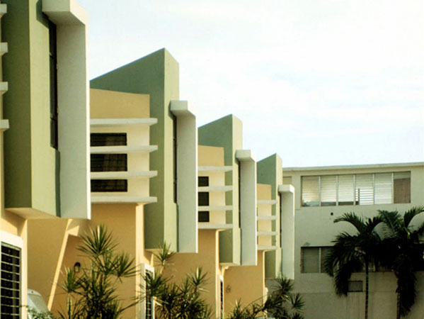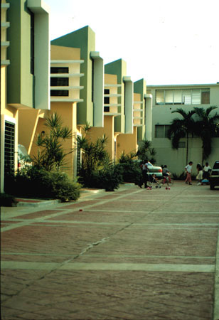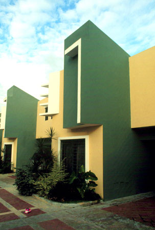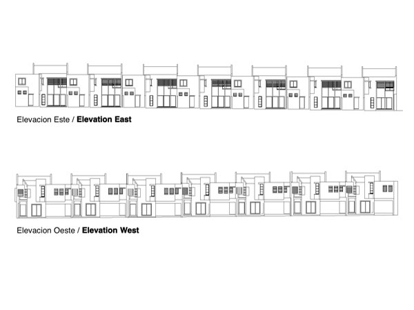 El encargo proviene de una oficina promotora de bienes raices (inmobiliaria casona), Tomando como punto de partida el programa arquitectonico usual,en este tipo de operaciones comerciales, dirigidas a un segmento especifico del mercado inmobiliario. Un lote de forma regular; 75 mts. x 30 mts. unos 2,200 mts2 aprox.,orientado en su parte longitudunal noreste-suroeste, de topografia llana y situado en la urbanizacion ,Las Praderas en la ciudad de Santo Domingo.(Las praderas es uno de estos tipicos desarrollosen nuestras ciudades latinoamericanas influenciados por las imagenes de los suburbios de Miami, Y de los centros vacacionales de fin de semana de nuestras zonas turisticas, asi sus reglamentaciones; Techos inclinados, aleros, materiales, etc.conducen a los diseñadores a plantear la soñada "CASA BARBIE" nuestro proyecto cumplio a cabalidad las normas de aprobacion, aunque su lenguaje formal contradice el vecindario) La intervencion arquitectonica propuesta consiste en la conformacion de 7 unidades de viviendas en hilera con ancho de 10.05 mts. y largo de 20.20 mts. desarrolladas en dos niveles, y aprox. 210 mts2. de edificacion construida. El proceso de formacion de la idea "muchas casas juntas" como lo entiende el publico comun y que para fines del mercado inmobiliario en nuestro pais, esta tipologia no es opcion habitual ,hacia replantearnos el hecho (construir la casa) asi fue originandose una estrategia para enfrentar el sentido compositivo y estructural de las unidades, en la que retomabamos elementos de la casa individual soñada, (patio,terraza, jardin frontal etc.) y lo recomponiamos en un esfuerzo espacial colectivo. asi los muros medianeros no se comparten fisicamente en los espacios interiores sino que resaltan la dualidad del muro, cerramiento-limite.La imagen exterior a la calle-plaza,(la via de acceso se diseño con materiales ,texturas, franjas de hormigon coloreado que delimitan pequeñosespacios reticulados como es frecuente en los pavimentos duros de nuetras plazas de la ciudad colonial) se compone basicamente de un "gesto-volumen" de proporcion vertical que marca el caracter individual de la unidad, este a su vez no es un volumen puro sino que esta compuesto por otras formas que se añaden con personalidad propia; Reforzadas por las asociaciones geometricas o el uso del color como parte intrinseca de estos volumenes relacionados en mestizaje con la linea y el plano,complementandose en una estructuracion volumetrica por adicion en donde cada uno necesita incondicionalmente del otro para reforzar su geometria e imagen colectiva, En el primer nivel se desarrollan las areas sociales y de servicio,el salon principal es un "gesto volumen"que se adelanta , que recibe, que define, aislado por los accesos, uno frontal, que comunica a la (calle- plaza ) , que es un muro inclinado que se desliza buscando proteger de la interperie, el otro desde el garaje abierto, convirtiendose estos con el area de la escalera en el nucleo central de distribuicionde los recorridos y flujos circulatorios;El estar,comedor,cocina y area de servicios se disponen alrededor de un patio lateral, (esquema tomado de nuestras antiguas casas coloniales, y por estas de las tradicionales villas romanas) punto focal de la disposicion general, se relaciona con el estar a traves de una terraza cubierta con un alero apoyado en tubulares metalicos de color rojo que protege las aberturas de la habitacion del segundo piso como el area de la terraza ,de las inclemencias del clima. Por el patio se ilumina y se ventila apropiadamente las dependencias;la cocina a traves de ventanas altas a ras de techo y con cristales opacos que inpiden visuales directas ,esta a su vez con las areas de lavado y dormitorio de servicio etc. comunicados a un corredor posterior que relaciona todas las unidades con la calle de acceso y por donde se disponen los servicio de apoyo basicos, recogida de basura,suministros etc.En el segundo piso se disponen las areas privadas, dos de las habitaciones se configuran en torno al patio,la principal se conecta a traves de una ventana en esquina con aleros proyectados que la protegen y sombrean la otra queda cubierta con el alero sobre la terraza y una tercera; La habitacion que mira a la calle, se retrotrae , y produce una incision que divide las unidades ; funciona como tunel de ventilacion y facilita la iluminacion natural (pobre muchas veces en estas tipologias) reforzando la idea de imagen individual entre las masas.